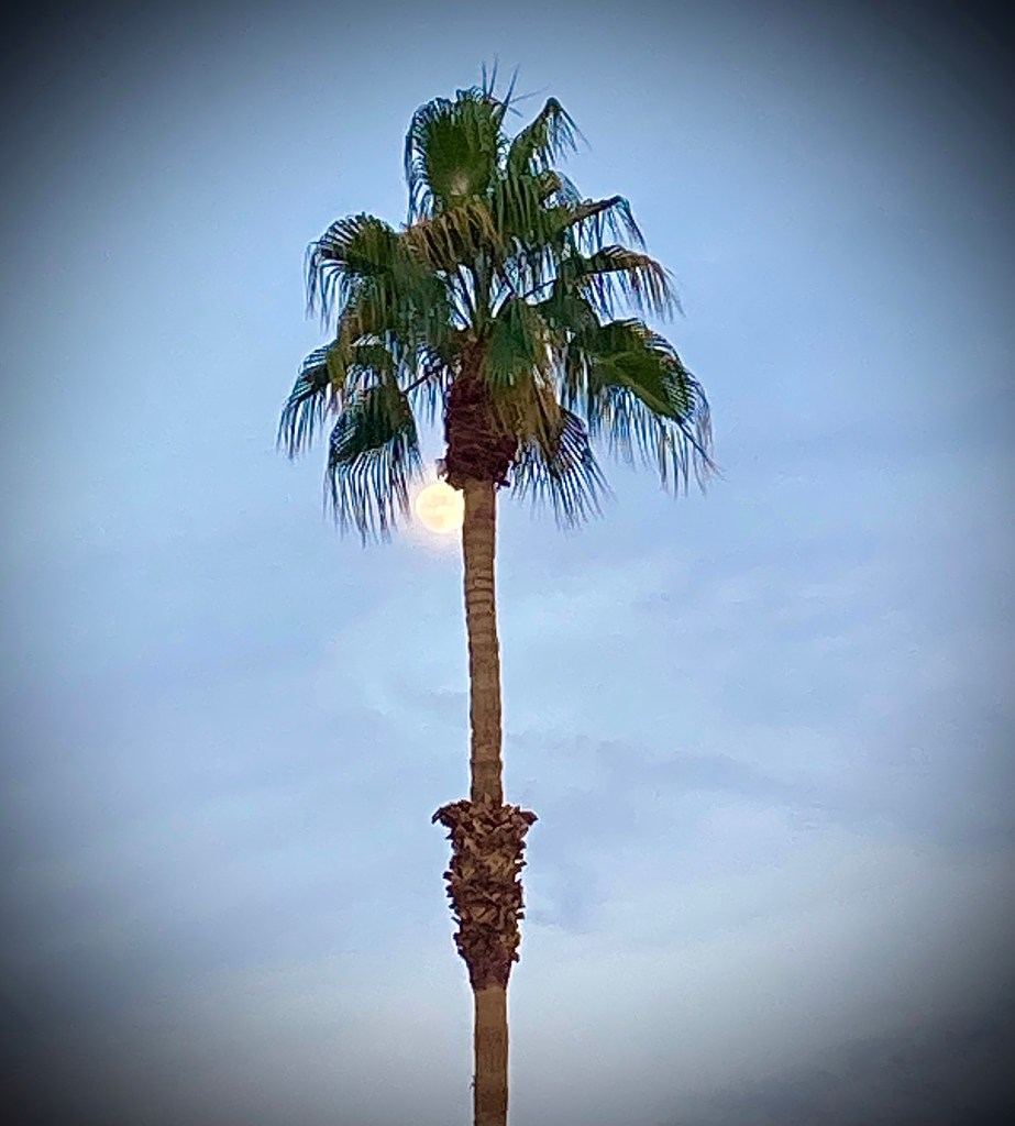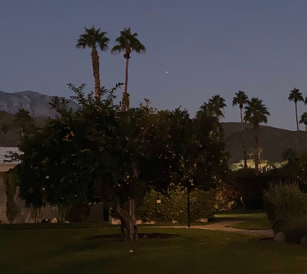 Sure enough, there she was, saucer-round and spotlight-bright, going down behind the San Jacinto Mountains which flank this valley and are thrillingly located right across the street, on the other side of Highway 111.