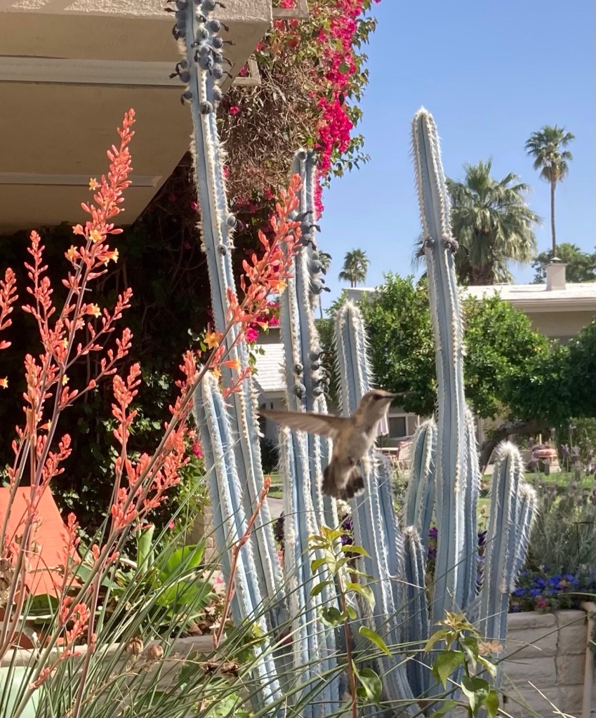 Columnar cactus, lantana, and bougainvillea in full bloom.