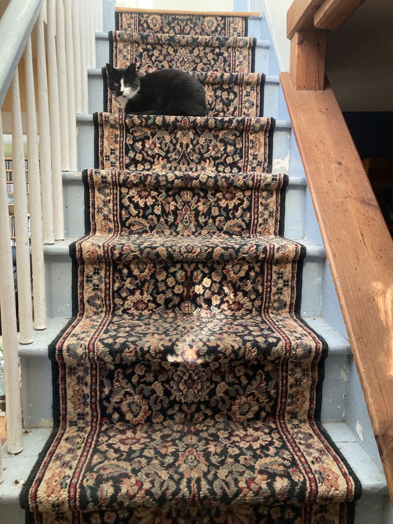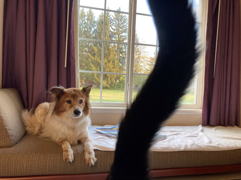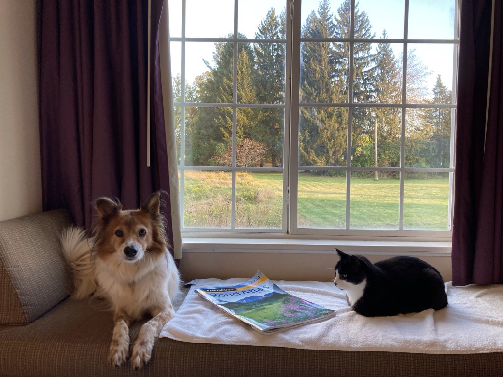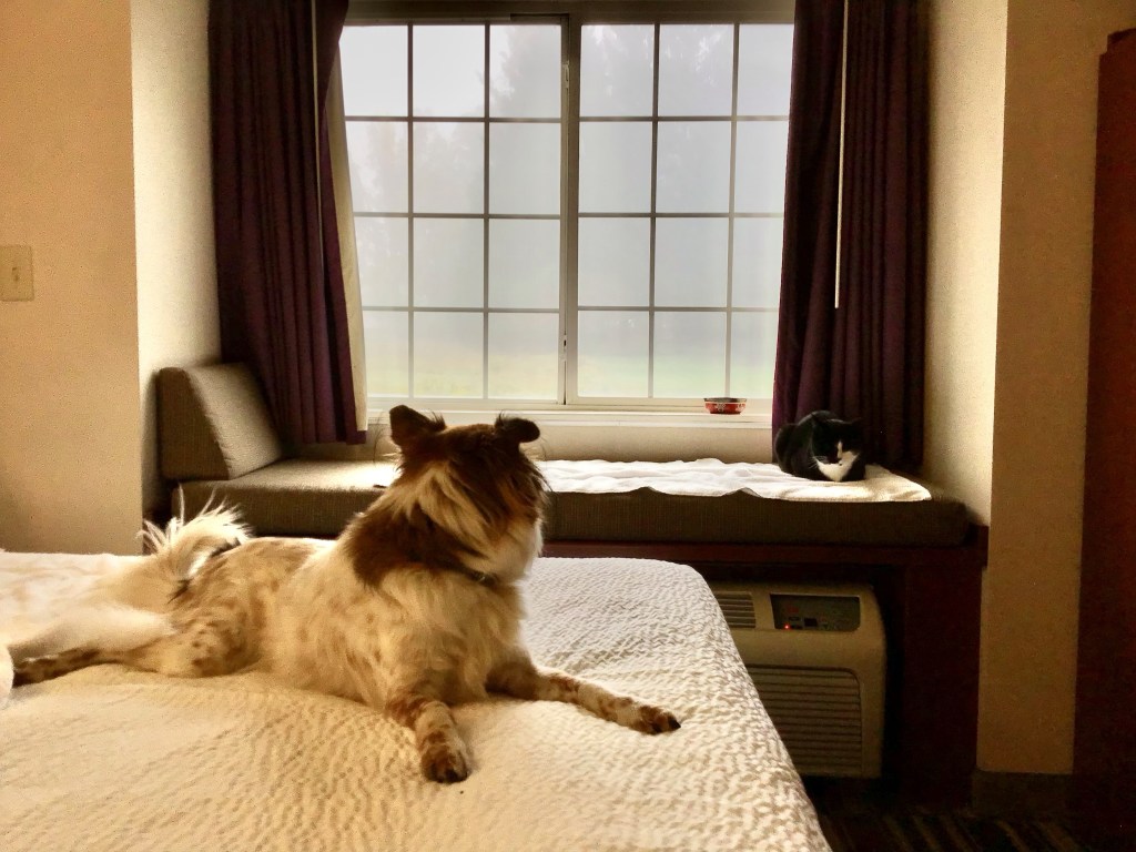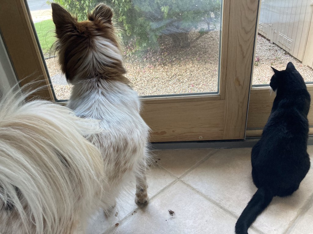 It was fun to see Timi and Clyde express their relief and their happiness to realize we were home again. Here they are in one of their favorite familiar lookout spots—watching the action in and around the bougainvillea bush.